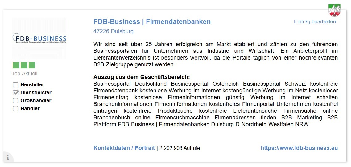 Die FDB-Portale sind seit über 25 Jahren erfolgreich am Markt etabliert und zählen zu den führenden Businessportalen für Unternehmen aus Industrie und Wirtschaft.